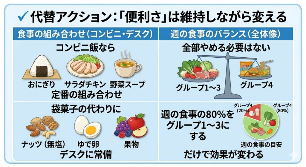 ✓ 代替アクション:「夜遅く食べざるを得ない」人への現実的な対策