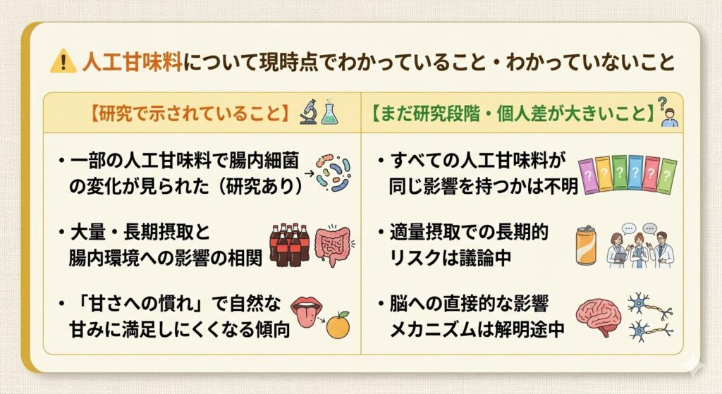 2022年にCellに掲載されたワイツマン科学研究所の研究では、サッカリン・スクラロース・アスパルテームなどの非栄養甘味料が腸内細菌叢の組成を変化させ、血糖コントロールに影響する可能性が示されました。ただしこの研究は特定条件下での短期実験であり、長期的な影響については継続的な研究が必要な段階です。