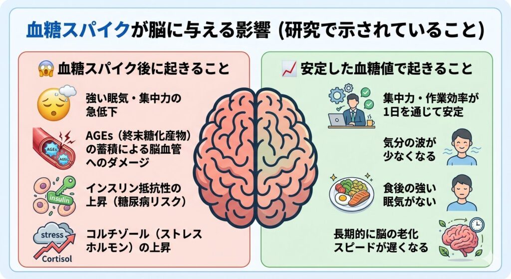 食後に眠くなる、午後3時頃に急激に集中力が落ちる——これらは「血糖スパイク」のサインです。血糖値が急激に上がり、その後急降下する「血糖乱高下」が脳に大きなストレスを与えます。