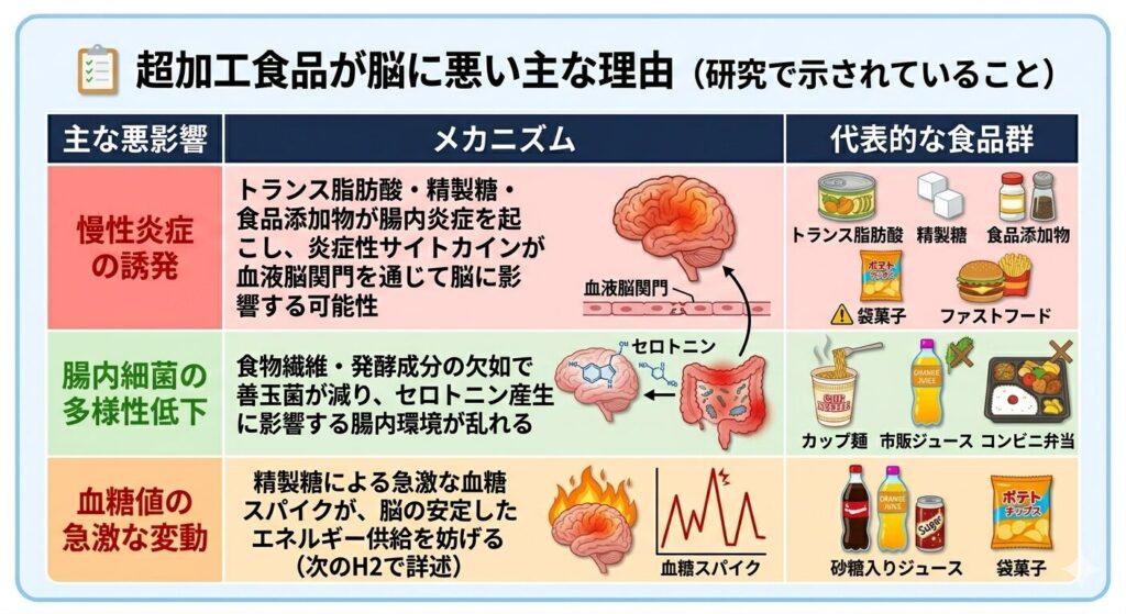 2022年にJAMA Neurologyに掲載された研究(Gomez-Donoso et al.)では、超加工食品の摂取量が多いグループほど認知症リスクが高い傾向が確認されています。また腸内細菌の多様性が低下することで、腸脳相関を通じた精神的健康への影響も研究が続いています。