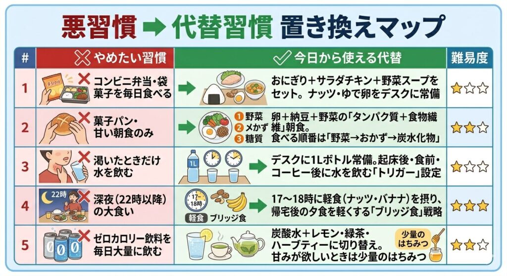 5つの悪習慣を知ったところで、「全部やめるのは無理」と感じた方も多いでしょう。その通りです。すべてを一度に変える必要はありません。ポイントは「やめる」ではなく「置き換える」ことです。