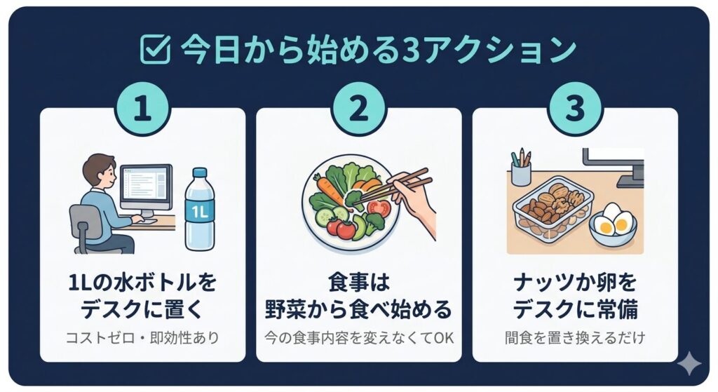 「脳に悪い食習慣」のほとんどは、意識していないだけで今日から変えられるものばかりです。完璧な食事を目指す必要はありません。今日から1つだけ「水ボトルをデスクに置く」を実行してください。それだけで脳が変わる第一歩になります。