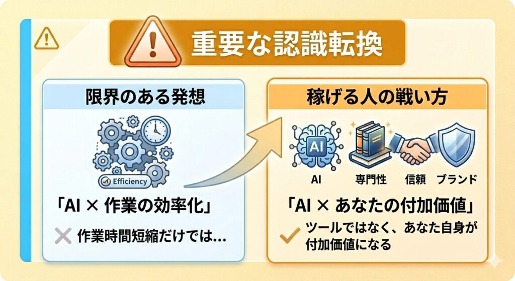 これが最も危険な思い込みだ。AIは生産性ツールであって、「稼ぐ仕組み」そのものではない。ハンマーを持ったからといって、自動的に大工になれるわけではないのと同じだ。