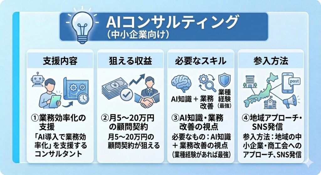 • 必要なもの:AI知識 + 業務改善の視点(業種経験があれば最強)