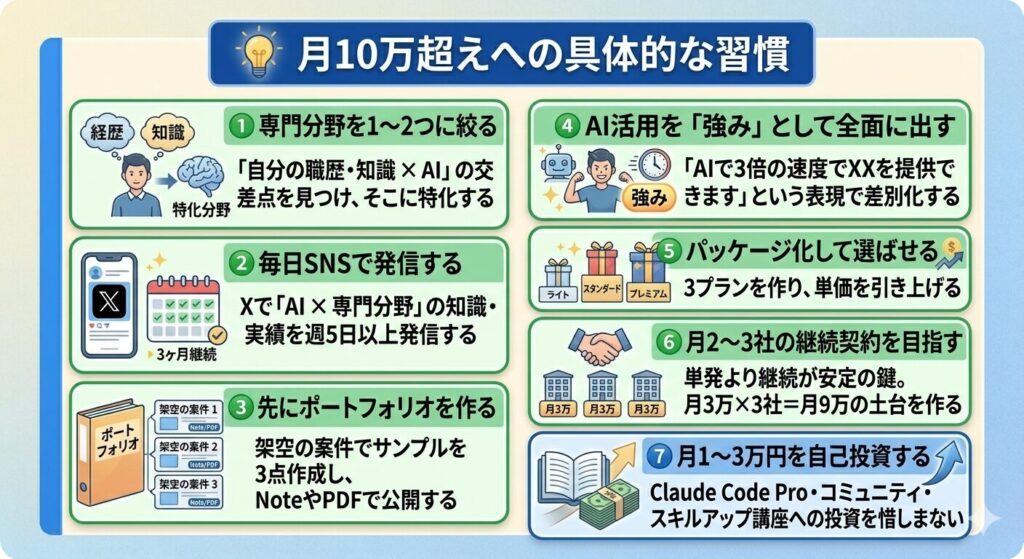 • 月10万超えの人は「専門特化・発信・高単価交渉・継続契約」の4点を実践している