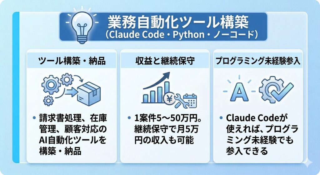 はい。コンテンツ制作・コンサルティング系のジャンルはプログラミング不要です。ただし、Claude Codeなどのツールを使って業務自動化ツールを作る場合は、「プロンプトでAIに指示を出す」スキルが必要です。完全なコーディングは不要ですが、論理的な思考力と粘り強さは必要です。