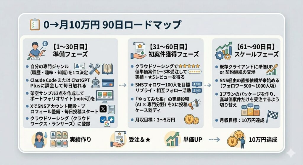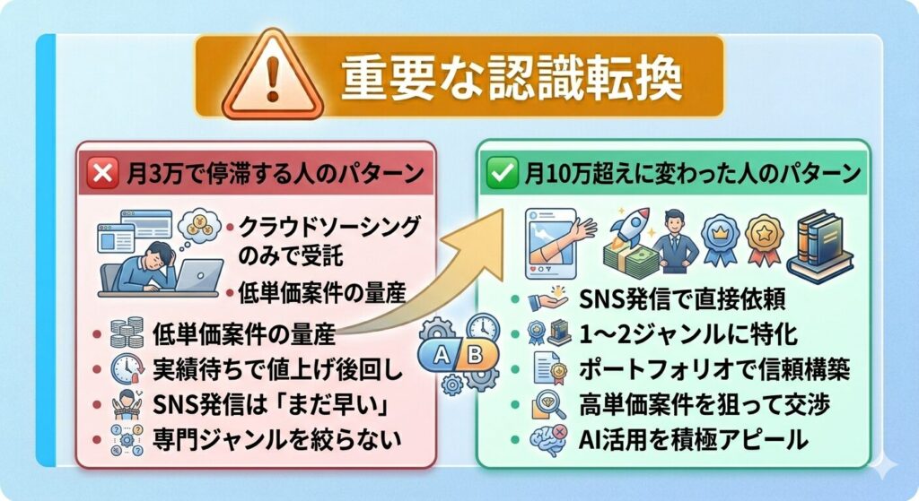 最初はオファーが減るかもしれないが、空いた時間で発信・交渉・スキルアップに集中できるようになる。これが月10万円への入り口だ。