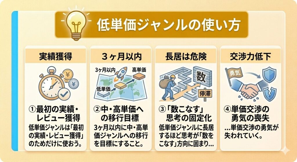 「実績がないから安く受ける→安い案件しか来ない→実績が貯まらない」という無限ループに入ってしまう人が非常に多い。