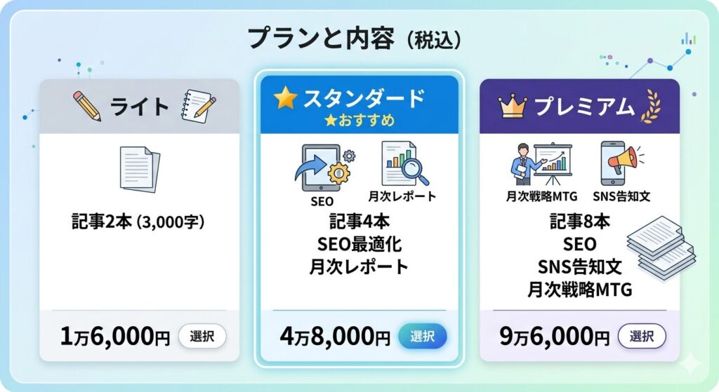 ✅ OK例:「御社のブログを月3本制作することで、SEO経由の問い合わせが月10〜20件増加した事例があります。その場合、広告費換算で月15〜20万円分の集客効果が見込めます。料金は月3本で2万4,000円です」