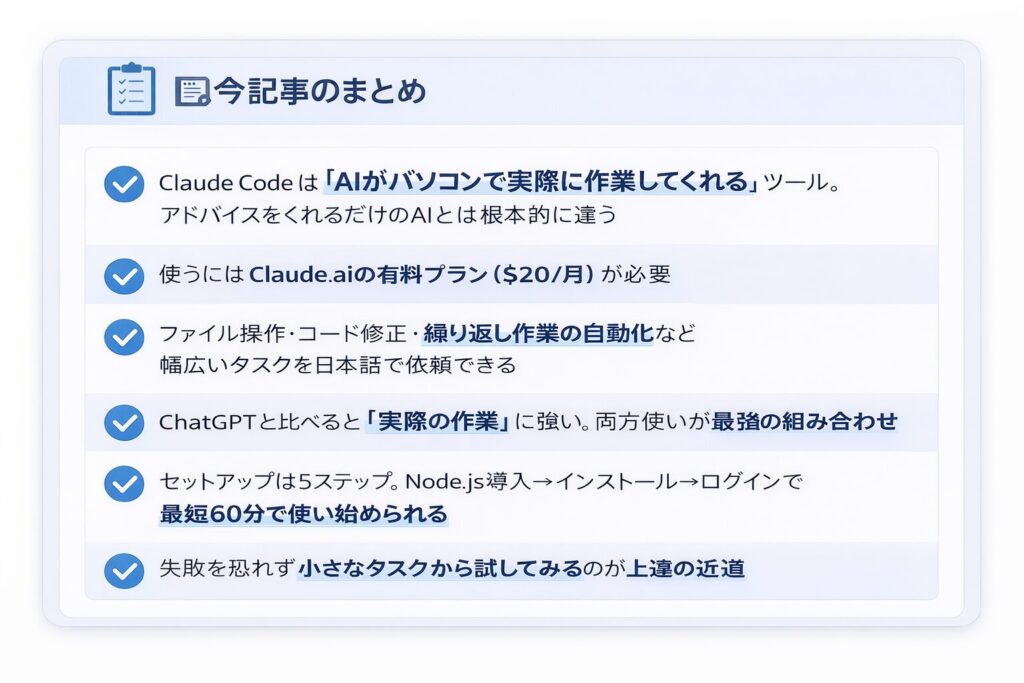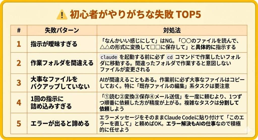 Claude Codeを始めた多くの人が「最初ここでつまずいた」と語るポイントが5つあります。あらかじめ知っておくだけで、スムーズに使い始められます。
