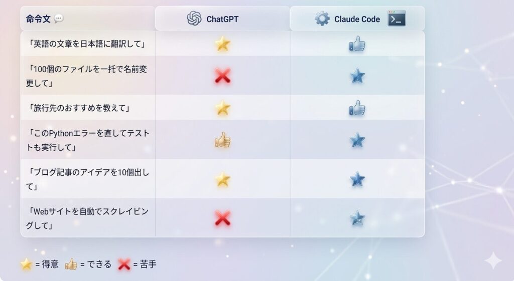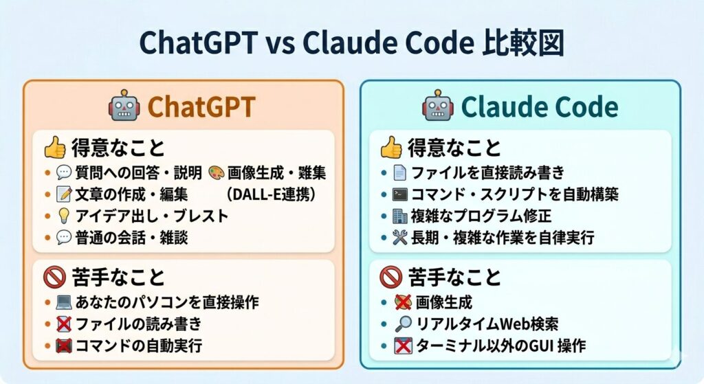 「Claude CodeとChatGPT、どう違うの?」はよくある質問です。一言で言うと、ChatGPTは「会話で答えてくれる先生」、Claude Codeは「実際に作業してくれる職人」です。