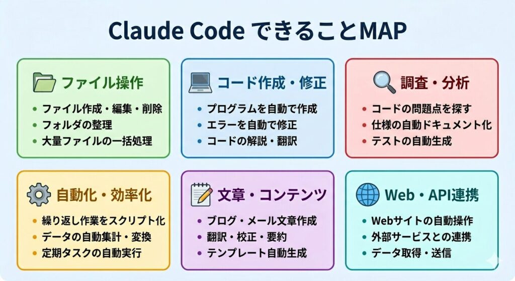 Claude Codeは「プログラマーだけの特別なツール」ではありません。日本語で話しかけるだけで、パソコンの作業を肩代わりしてくれる万能な助手です。