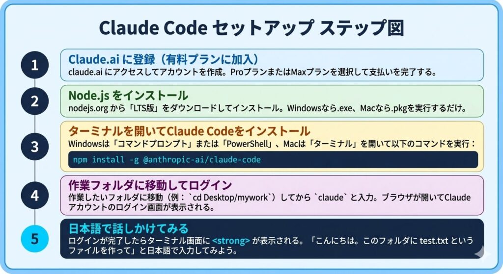 Claude Codeを使い始めるには、5ステップで完了します。一つひとつは難しくありませんが、順番通りに進めることが大事です。